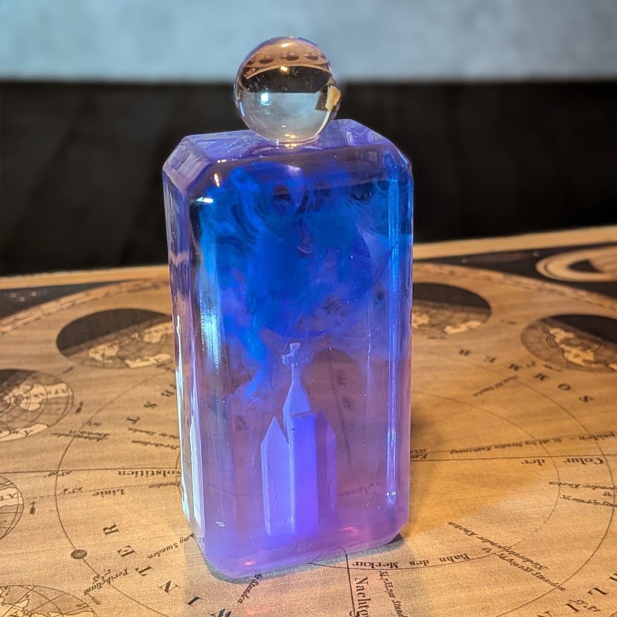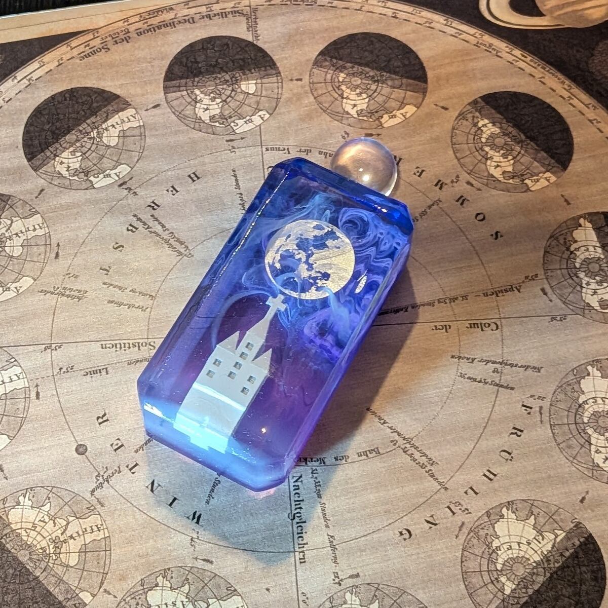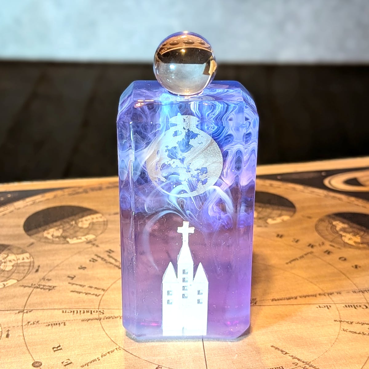 大きく輝く満月の下、静かに佇む教会の情景を小瓶に埋め込みました。