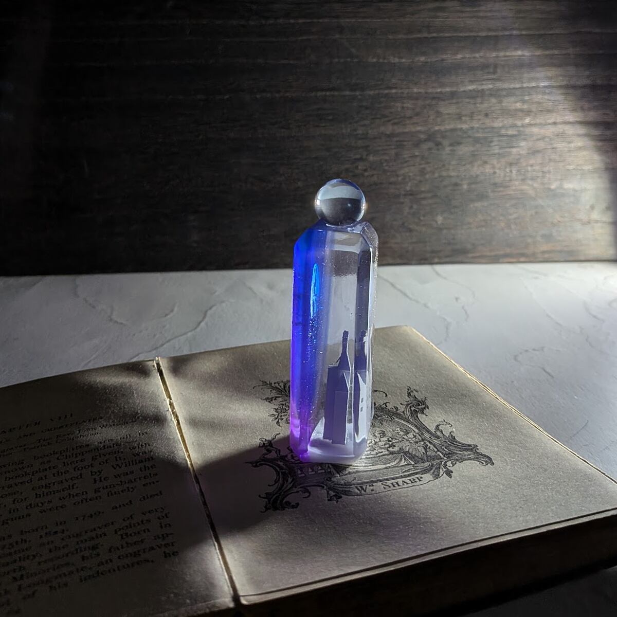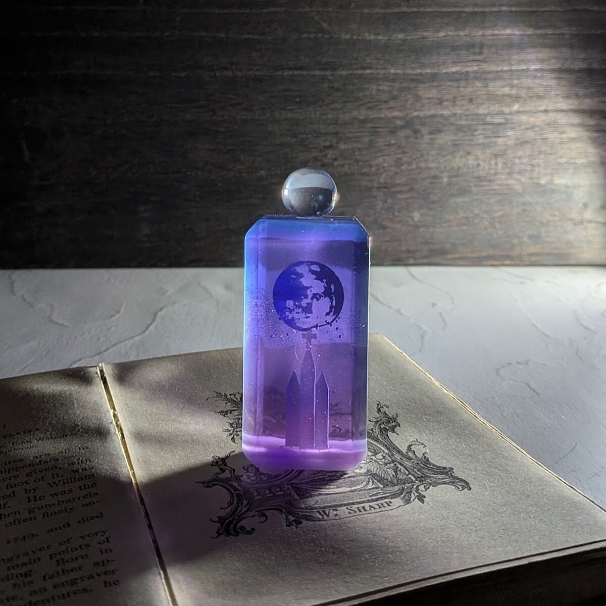 薔薇色から青色へと変わる空のなかで銀色に輝く満月のもと、静かにたたずむ教会の情景を小瓶に埋め込みました。