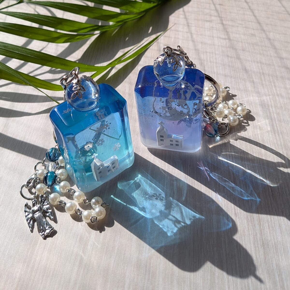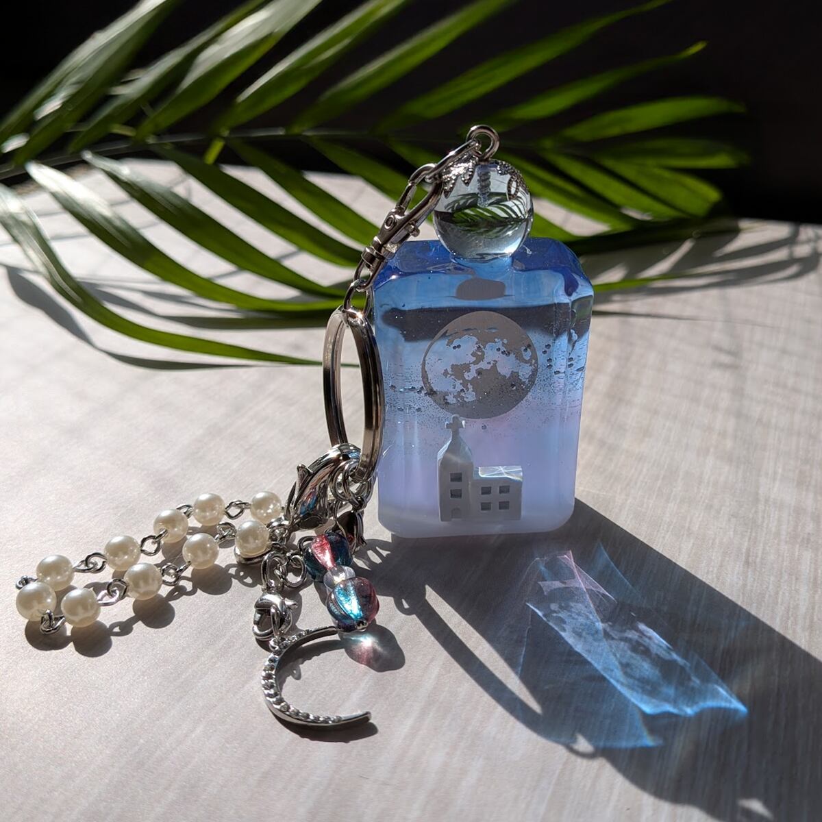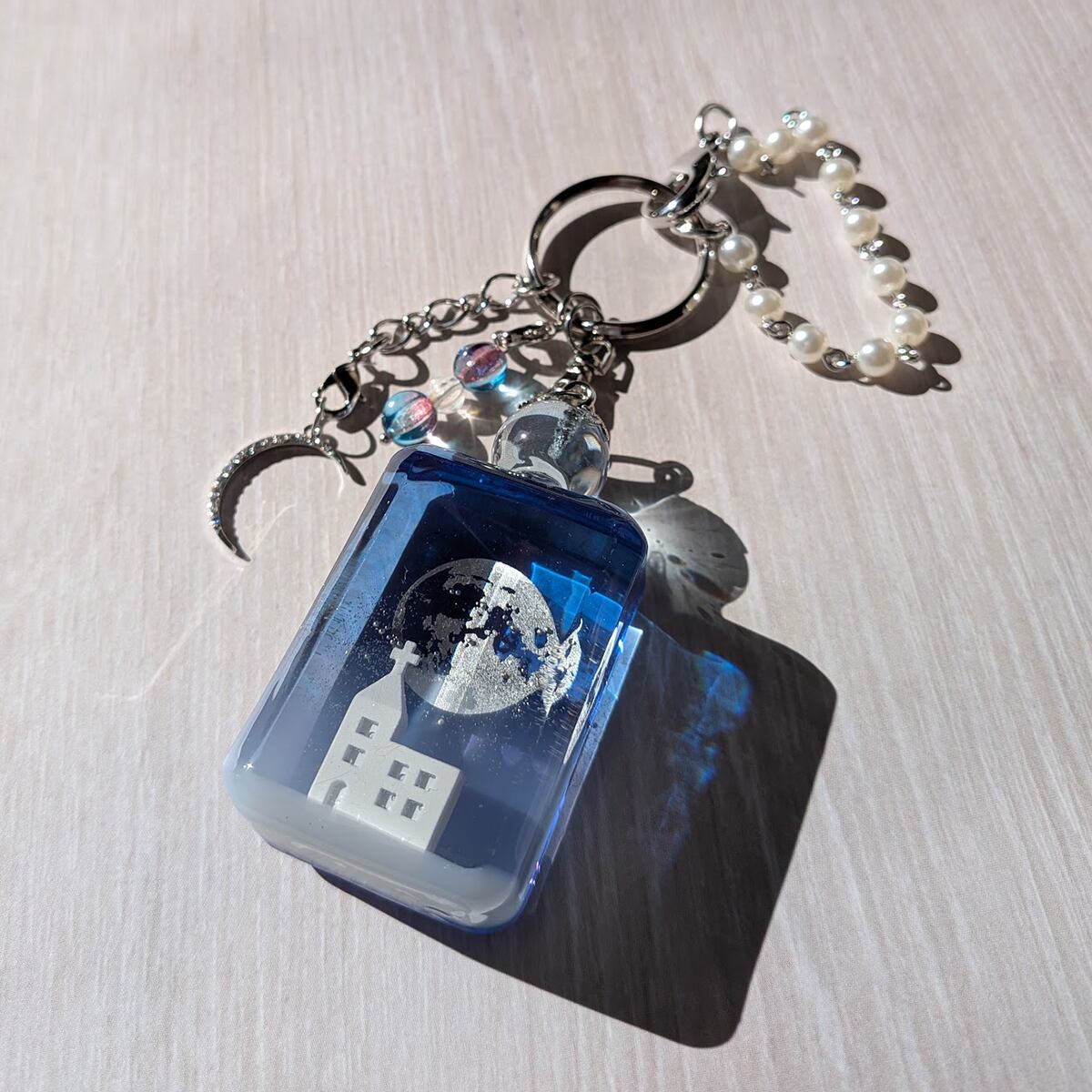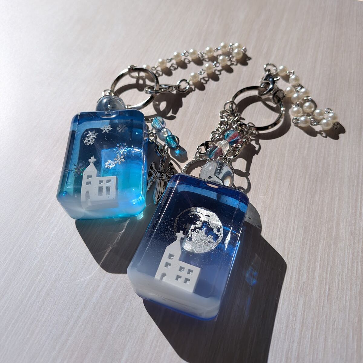 銀色に輝く満月のもと、静かにたたずむ小さな教会の情景を小瓶のバッグチャームにしました。