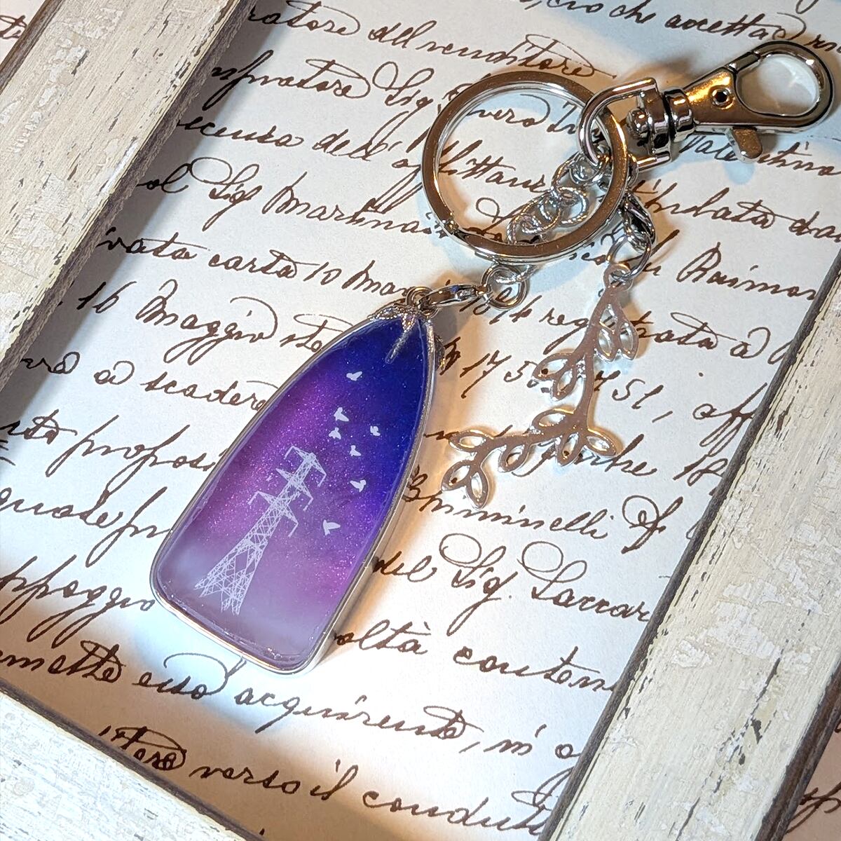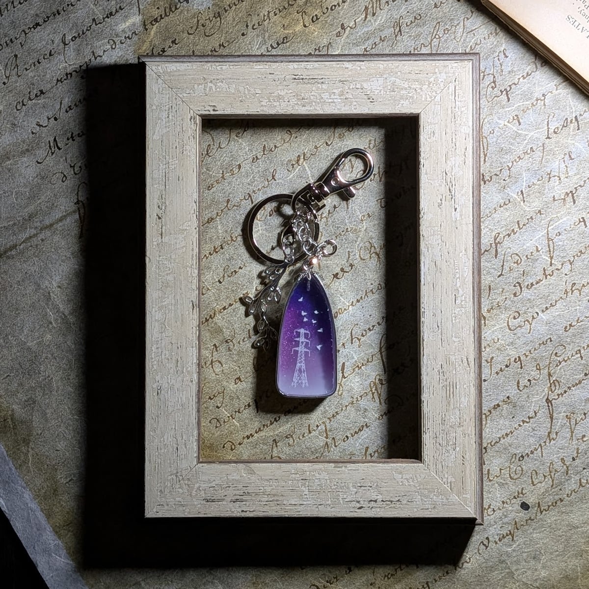 夕暮れから夜へと移ろう空の中、静かに立つ鉄塔と、そのそばをかすめる白い鳥たちの姿を描いたペンダントトップです。