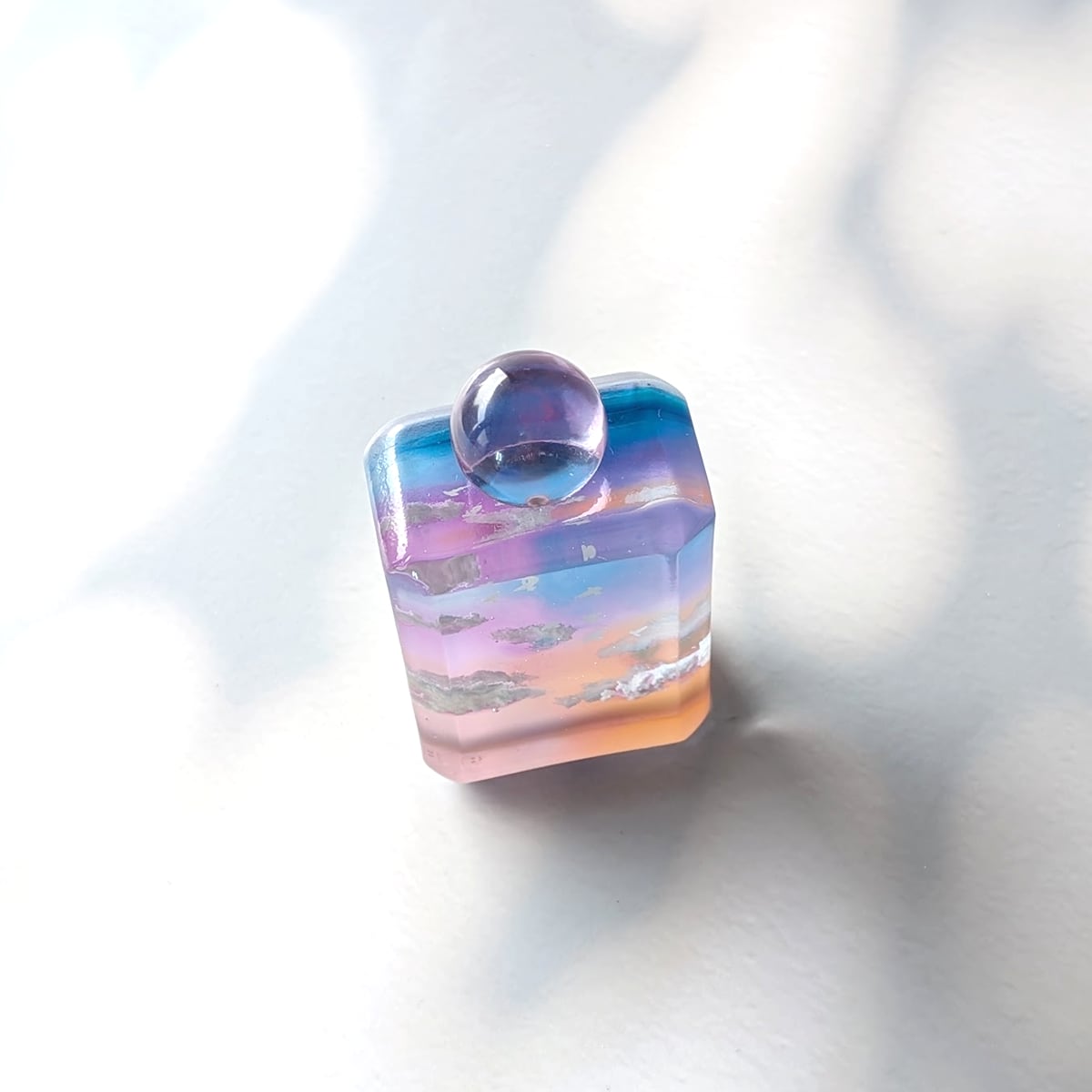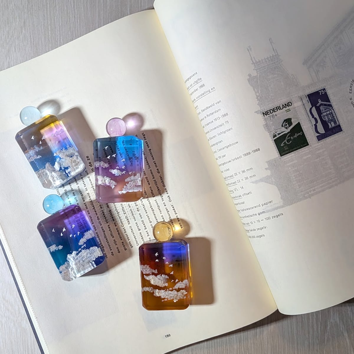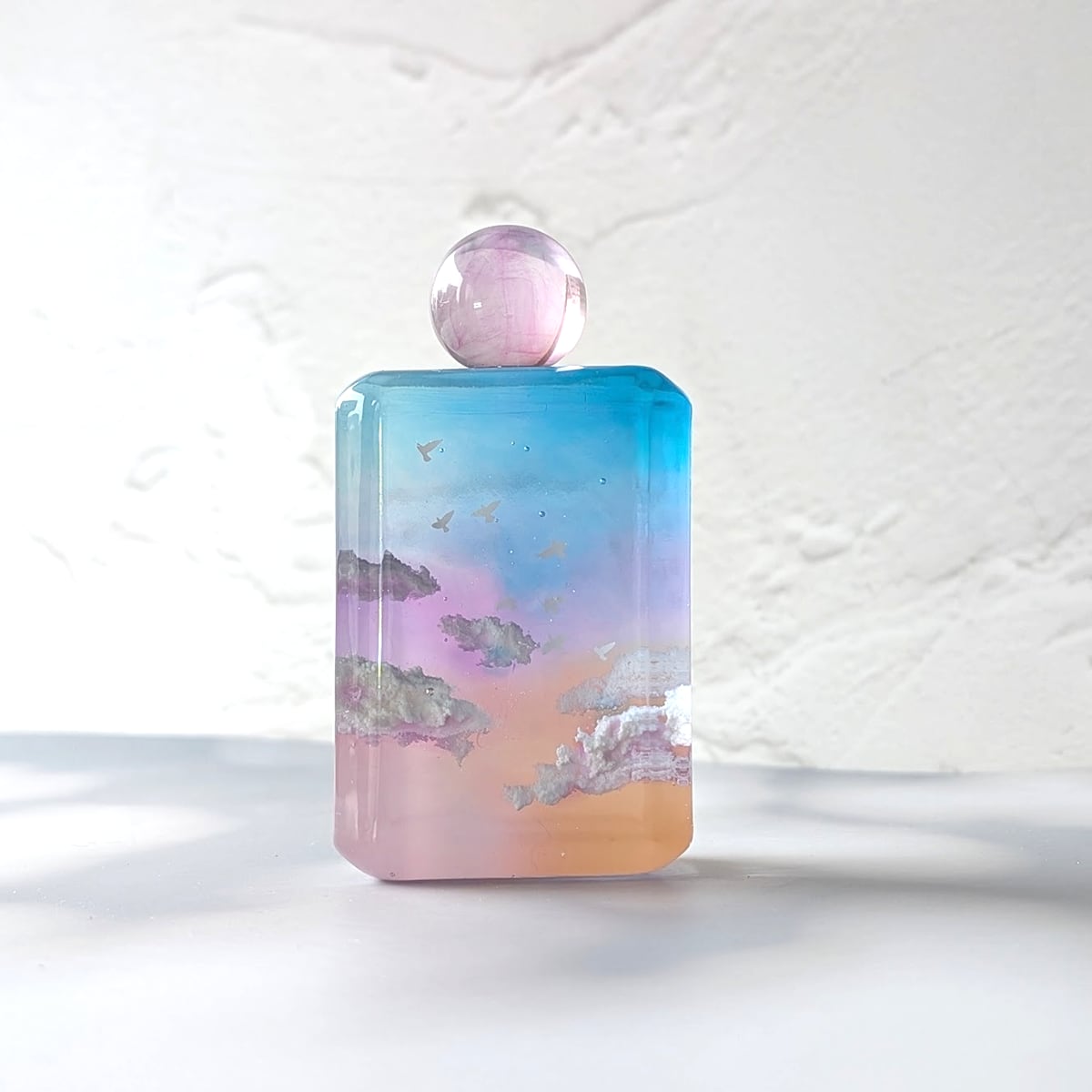 刻々と色を変える夕暮れの空に白い鳥の群れが舞う風景を小瓶に閉じ込めました。